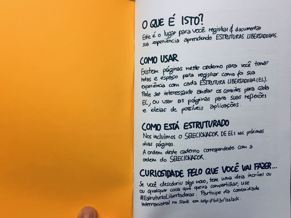 Existem páginas neste caderno para você tomar notas e espaço para registrar como foi sua experiência com cada Estrutura. Pode ser interessante anotar os convites para cada EL, ou usar as páginas para suas reflexões e ideias de possíveis aplicações.